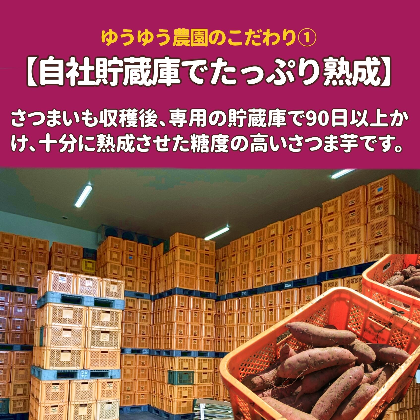 収穫後すぐには出さず、専用の貯蔵庫で90日以上かけて熟成させることで、紅はるからしい濃厚な甘みを引き出しています。